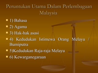 221 menyenaraikan peruntukan-peruntukan utama yang terkandung dalam perlembagaan malaysia 222 menyatakan kedudukan bahasa melayu sebagai bahasa kebangsaan 223 menyatakan peruntukan kewarganegaraan 224 menjelaskan kedudukan istimewa orang melayu 225 menjelaskan kedudukan agama islam sebagai agama. 88 UNSUR-UNSUR TRADISI DALAM PERLEMBAGAAN Pembentukan perlembagaan Malaysia telah melalui satu proses sejarah yang panjang. Merupakan adunan unsur-unsur yang terdapat dalam sistem pemerintahan Melayu lama dan juga penjajah Inggeris.